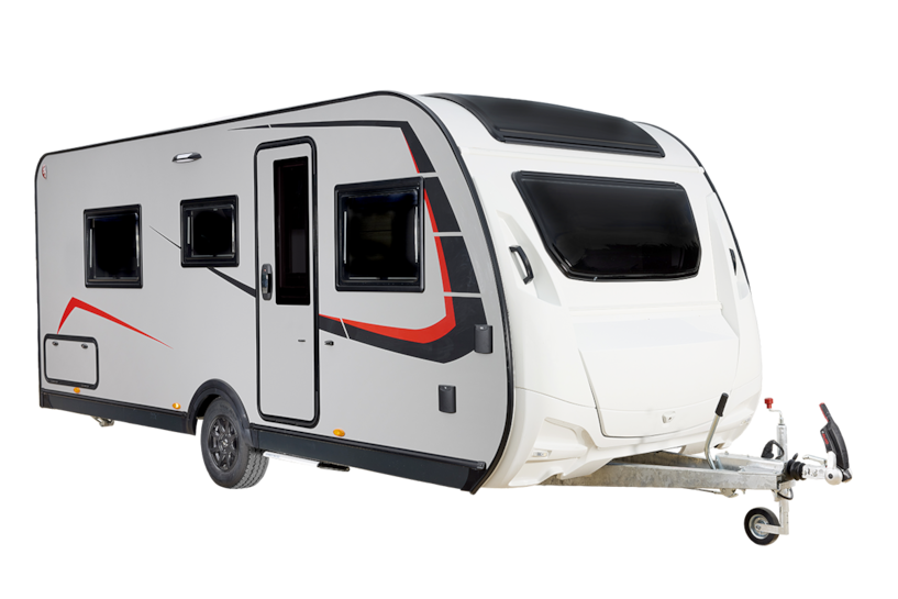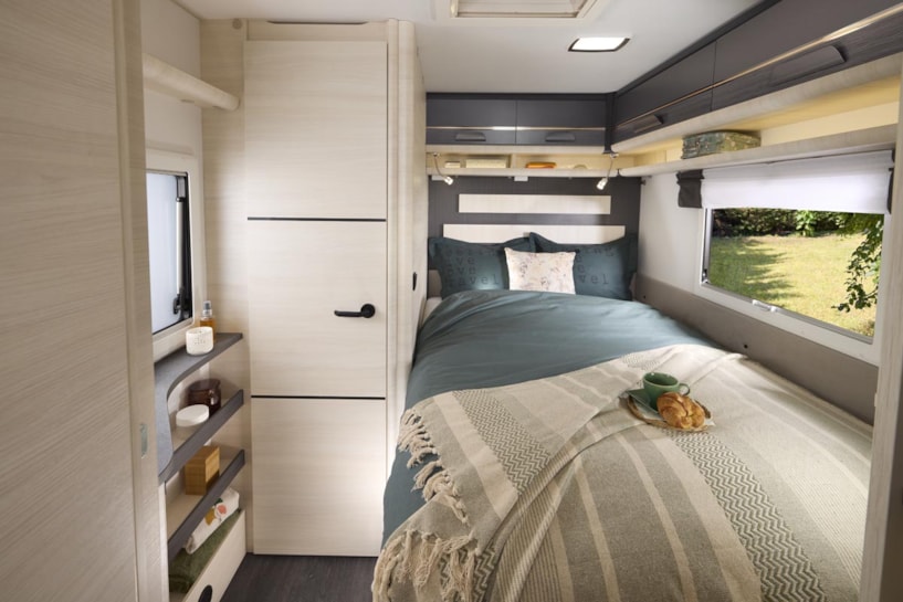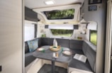 Além das camas individuais e da casa de banho, esta caravana de 5,2 metros inclui ainda um lounge em forma de U e uma barra suspensa.